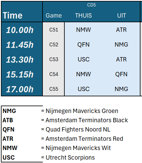 Op vrijdag 16 mei begint de vijfde competitiedag bij de Nijmegen Mavericks. In hun eigen sporthal ontvangen zij de teams voor een dag vol beslissende wedstrijden, waar elke punt telt.
