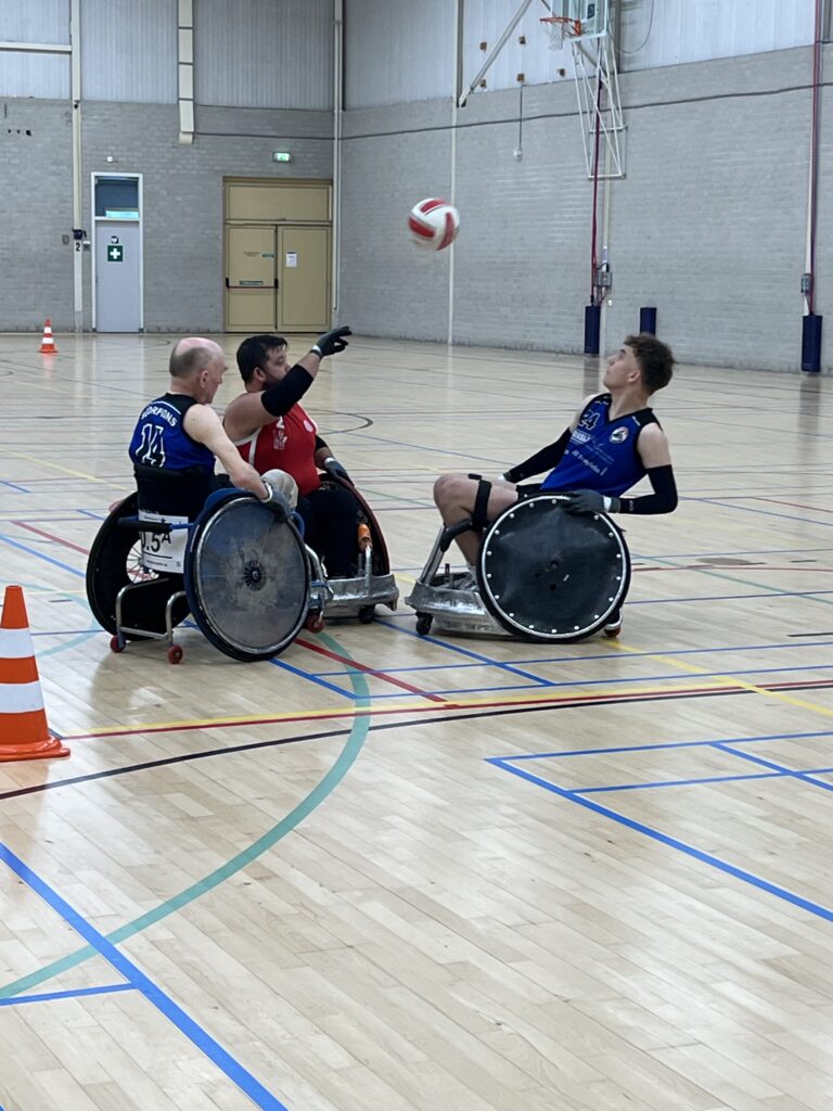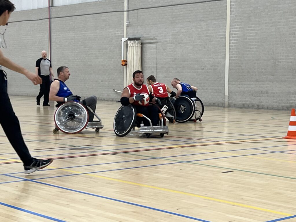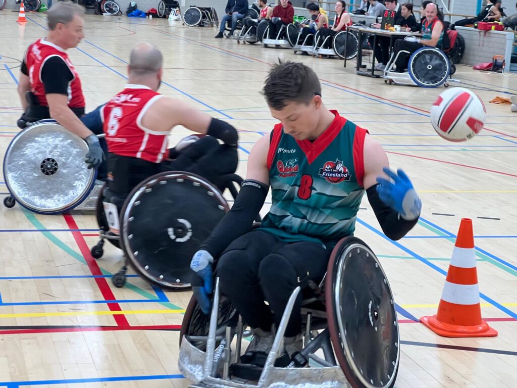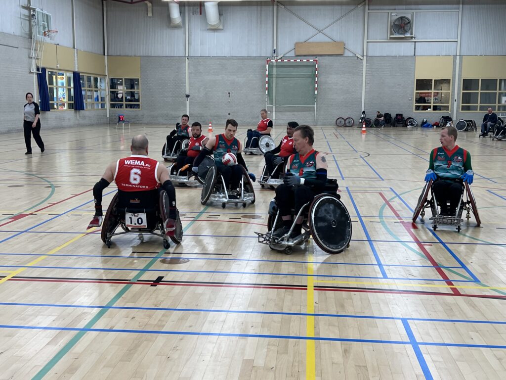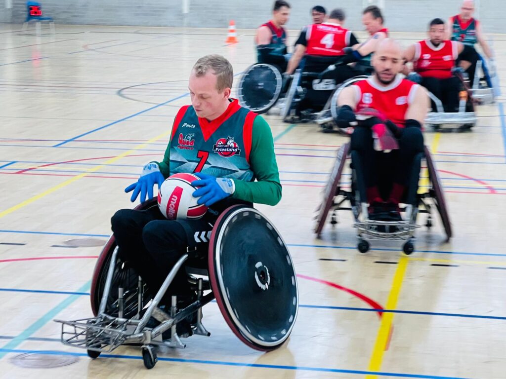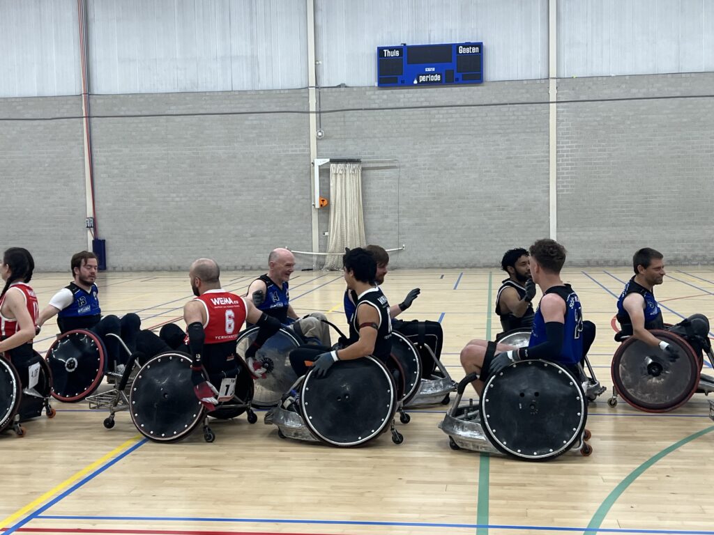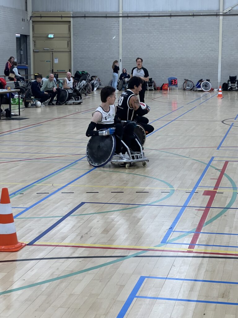 Onderstaande foto’s geven een indruk van verschillende competitiedagen in het rolstoelrugby. Ze laten de dynamiek van de sport zien: van intensieve actie op het veld tot de enthousiaste reacties van spelers en coaches aan de zijlijn.