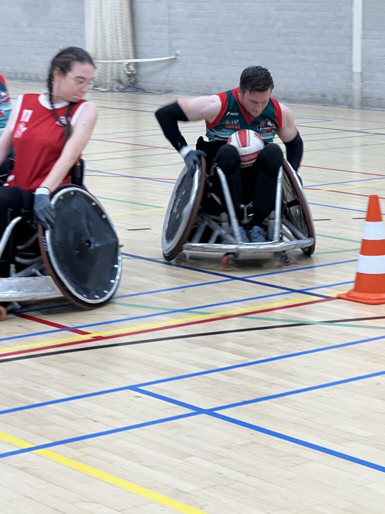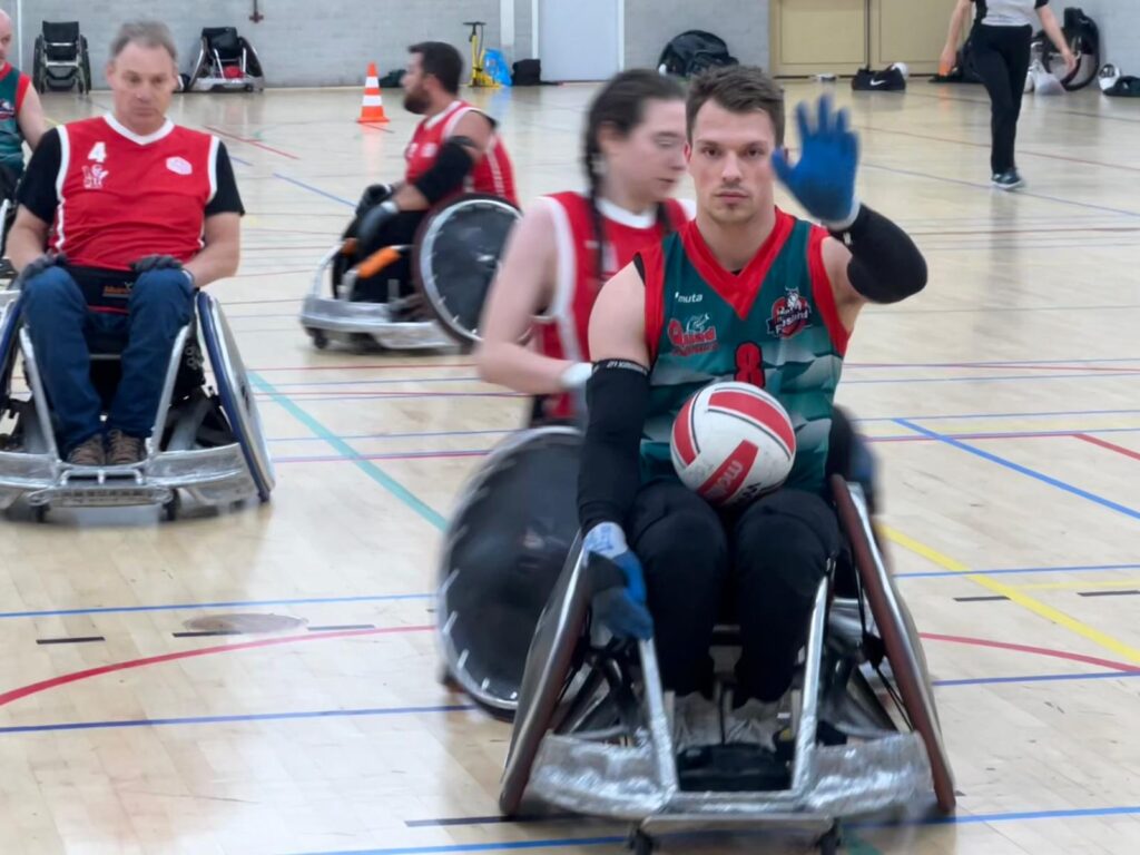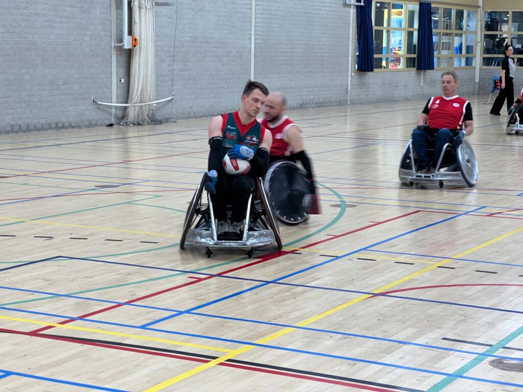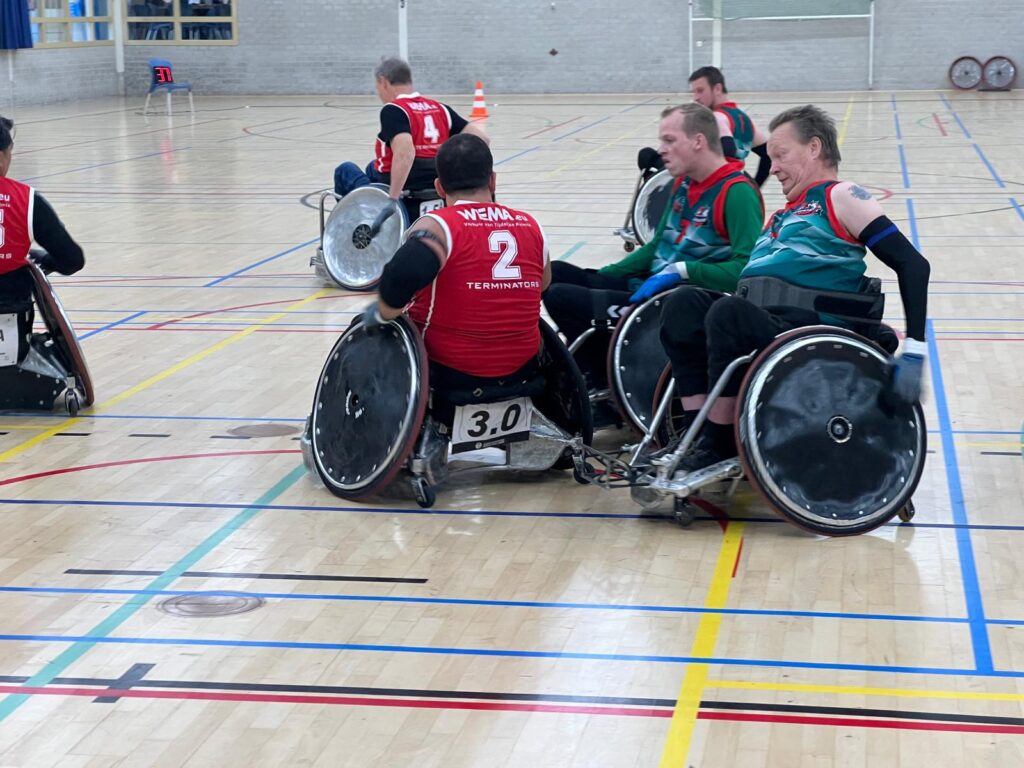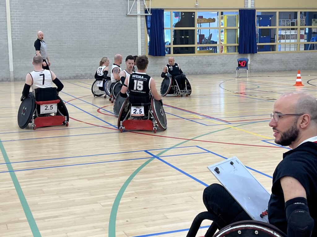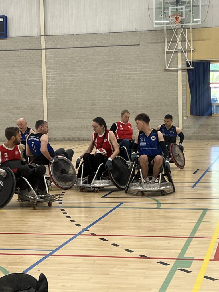 Onderstaande foto’s geven een indruk van verschillende competitiedagen in het rolstoelrugby. Ze laten de dynamiek van de sport zien: van intensieve actie op het veld tot de enthousiaste reacties van spelers en coaches aan de zijlijn.