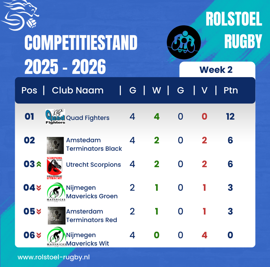 | 17.00 | Amsterdam Terminators Red – Quad Fighters Noord Nederland | 39 – 42 |